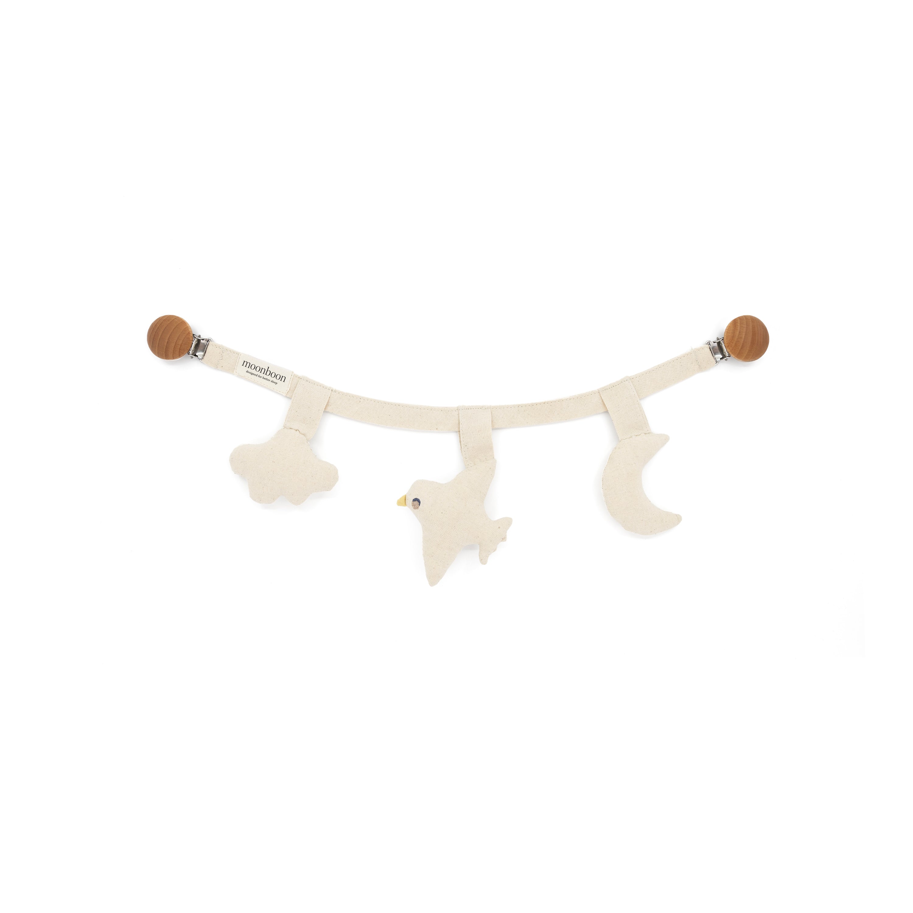 This enchanting stroller chain, featuring the Ole Lukøje bird, cloud, and moon, is designed to captivate and soothe. Perfect for creating peaceful moments at home or bringing a touch of magic to sleep on the go.